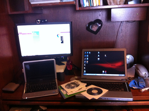 Then I hit the desk. There was a lot of stuff on and around the desk itself. When I pulled everything out it completely covered the dining room table. I didn’t take a picture till I had already dealt with some of it. I sorted. I trashed stuff. I untangled cords. I labeled and grouped and neatly tied up said cords. I dusted the actual desk.