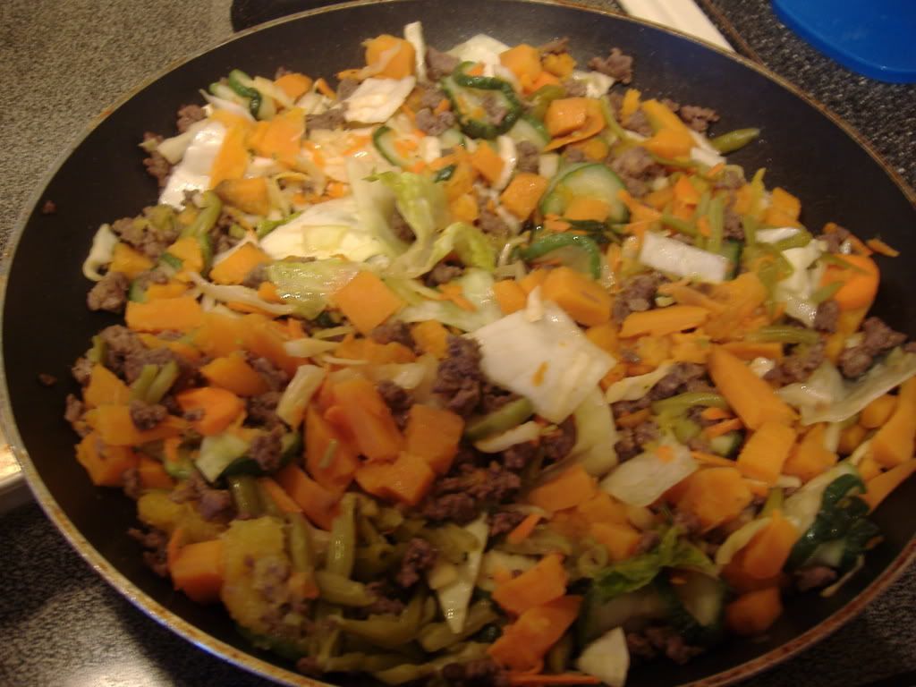 Here you can see I browned some ground beef (sometimes I use leftover chicken, ham, steak, whatever. I’ve even been know to throw a cut up hotodog in), some rinsed off cole slaw, cut cooked zucchini, a few tablespoons of leftover green beans, half a can of carrots, a few tablespoons of cooked mashed squash, and some leftover salad. Yes, that is green salad with lettuce and tomatoes etc in there-once it’s cooked up it tastes fine. Even cucumbers. Really. I’m telling you, you can use a little bit of everything.