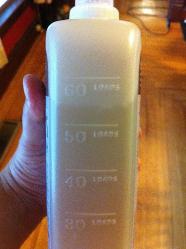 Another great idea is that they marked the number of loads left in the bottle on the side–so you can take a look at the side and see how many loads you have left before you need to buy more. The text is actually molded into the plastic so it won’t rub off!