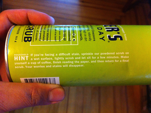 “If you’re facing a difficult stain, sprinkle our powdered scrub on a wet surface, lightly scrub and let sit for a few minutes. Make yourself a cup of coffee, finish reading the paper, and then return for a final scrub. Your worries and stains will disappear”