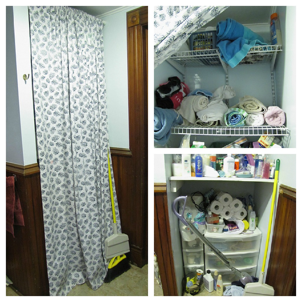 Of course it became a mess. The kids just tossed things in there, half the time stuff is poking out from behind the curtains. The pull towels out from the bottom of the shelf and the rest topple over and make a mess. . . Well, you’ve got eyes, you can see the picture above.