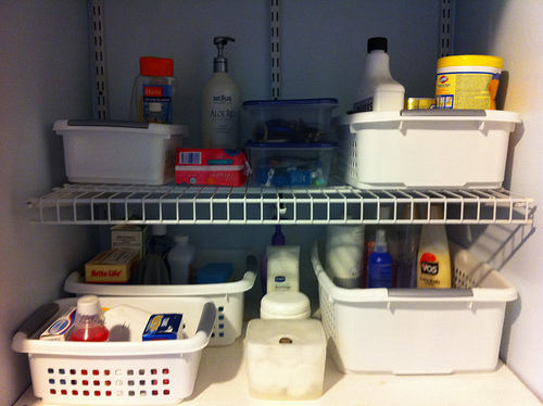 By using baskets and bins I can “containerize” like items–they can be sorted by type and then the entire bin can be removed from the shelf, the needed item can be located, and then the bin can be returned to it’s place. If the bins needed to be stacked two deep then the items that are used most frequently should be placed in front and items that are rarely used could be placed in back.