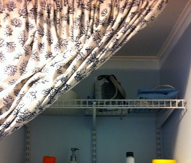 First of all the closet isn’t actually a closet. At some point someone just built a small wall out into the room and then stuck up some shelves in there. It’s narrowish and there isn’t an actual door frame or door. When we moved in it was just open with shelving in it–so I hung a shower curtain rod across the top and sewed up a really long curtain (these are 9 foot ceilings to nothing off the shelf was going to fit) to act as a door so we could store items in there without showing the world.