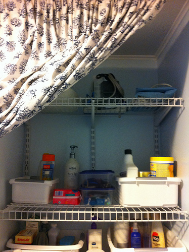 The first wire shelf is just a bit to high for the kids to access easily-so the items there are not things they really need to access. I’ve got a bin with all the dogs bath items (dog shampoo, nail clippers etc), a bin with the cleaning supplies, and a couple of lidded containers with extra toothbrushes/floss and hair ties etc. The extra shelf space is used for a few odd items that don’t fit in the bins–a particular aloe hair treatment we use when princess swims a lot and some feminine hygiene items that are stored there for guest emergencies and “someday”.