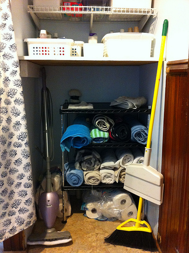 I set up the adjustable 3 tier shelves so that the bottom shelf was high enough to fit a standard pack of 12 toilet paper rolls underneath it on the floor. Then I used the two shelves for my towels–regular bath towels on bottom, beach size on top. The top of the shelf is to stack washcloths and hand towels. The space to the left can be used to stack paper towel rolls (they get stored in there) and if I angle the steam mop backwards it will fit under the shelf there as well.